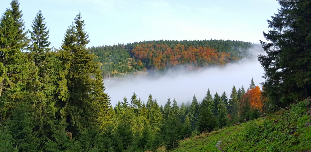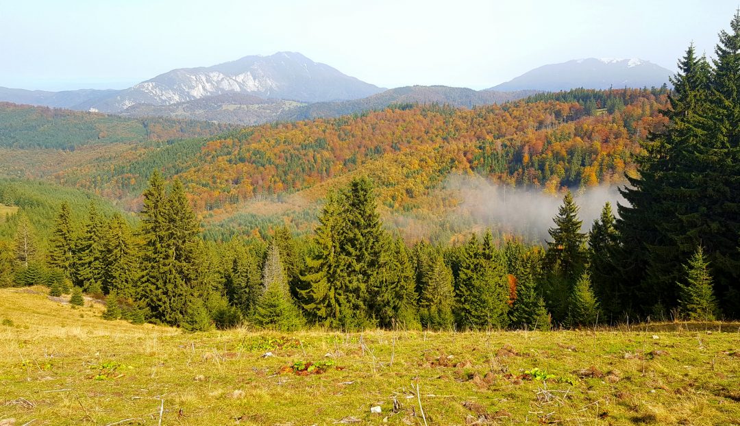 Soarele a ieșit brusc din nori și-a luminat întreaga zonă, dezvăluind peisaje de o frumusețe incredibilă! Norii alergau prin văi, mânați parcă de o mână invizibilă… Soarele accentua culorile frunzelor arămii, crestele munților pline de zăpadă se întrezăreau în depărtare… Cerul era albastru și completa perfect acest tablou! Un spectacol de culoare de care nu mă puteam sătura!