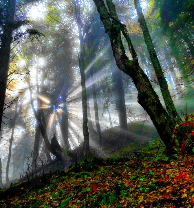 Soarele se ascunsese printre nori și din când în când mai trimitea câte o rază ce mângâia parcă frunzele copacilor. Era un spectacol magic de lumină și culoare.