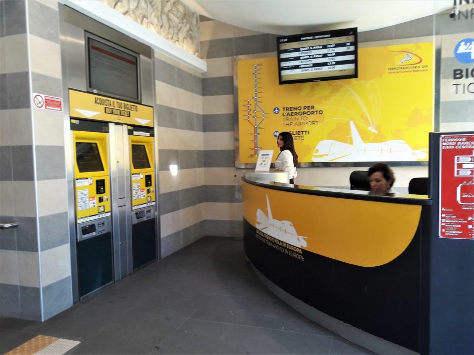 Poți să alegi varianta unei călătorii cu trenul dacă timpul de așteptare al autobuzului este prea lung, sau vrei mai mult confort. Din ce am observat, aceste două mijloace de transport nu au același orar de plecare. Durata călătoriei este ceva mai scurtă… 15 minute face trenul din Aeroportul Bari până în gara Bari Centrale. Prețul unui bilet este de 5€ și se poate achiziționa de la ghișeul aflat înainte de a intra în stația de tren.